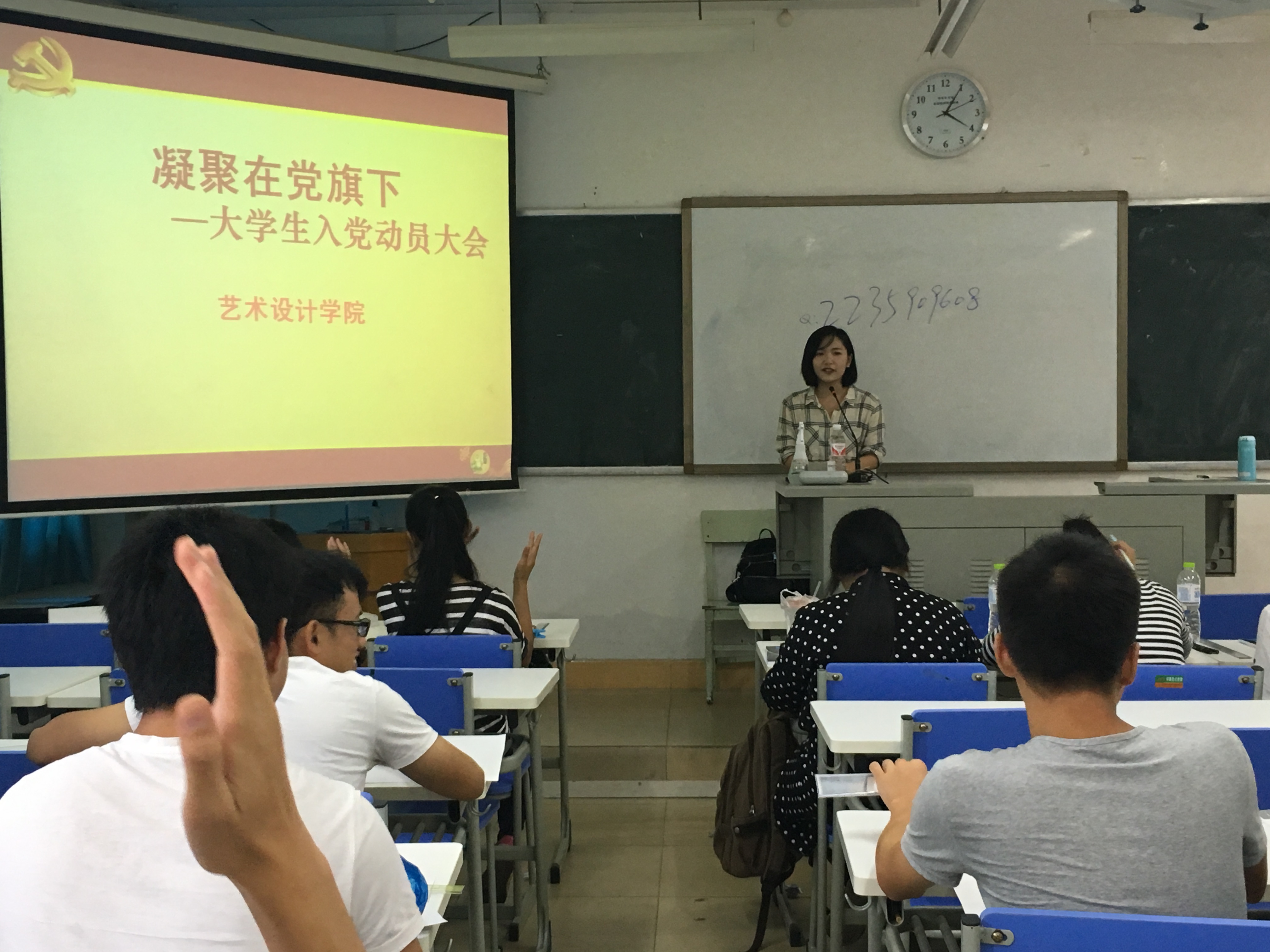新闻网消息(文/图 艺术设计学院 白兰)为加强入党积极分子的培训,做好学生党员的发展工作,端正入党动机,提高学生整体素质,给党组织推荐合格人才,2016年10月25日至11月5日,艺术设计学院2016级新生班辅导员分别下到各班级召开入党动员大会。 会上,各班辅导员为同学们详细解读了中国共产党的性质、根本宗旨、条件、义务和权利。表明只有争取早日加入中国共产党才是当代大学生实现人生理想的正确选择。实现中华民族伟大复兴的“中国梦”是当代青年的历史使命,每位同学都应有坚定的理想信念。 同学们纷纷表示要珍惜年华,刻苦学习,努力提高自身素质修养,增强身心健康,实现全面发展。在进一步了解党的基础知识的同时,学生们更加坚定了入党的决心。