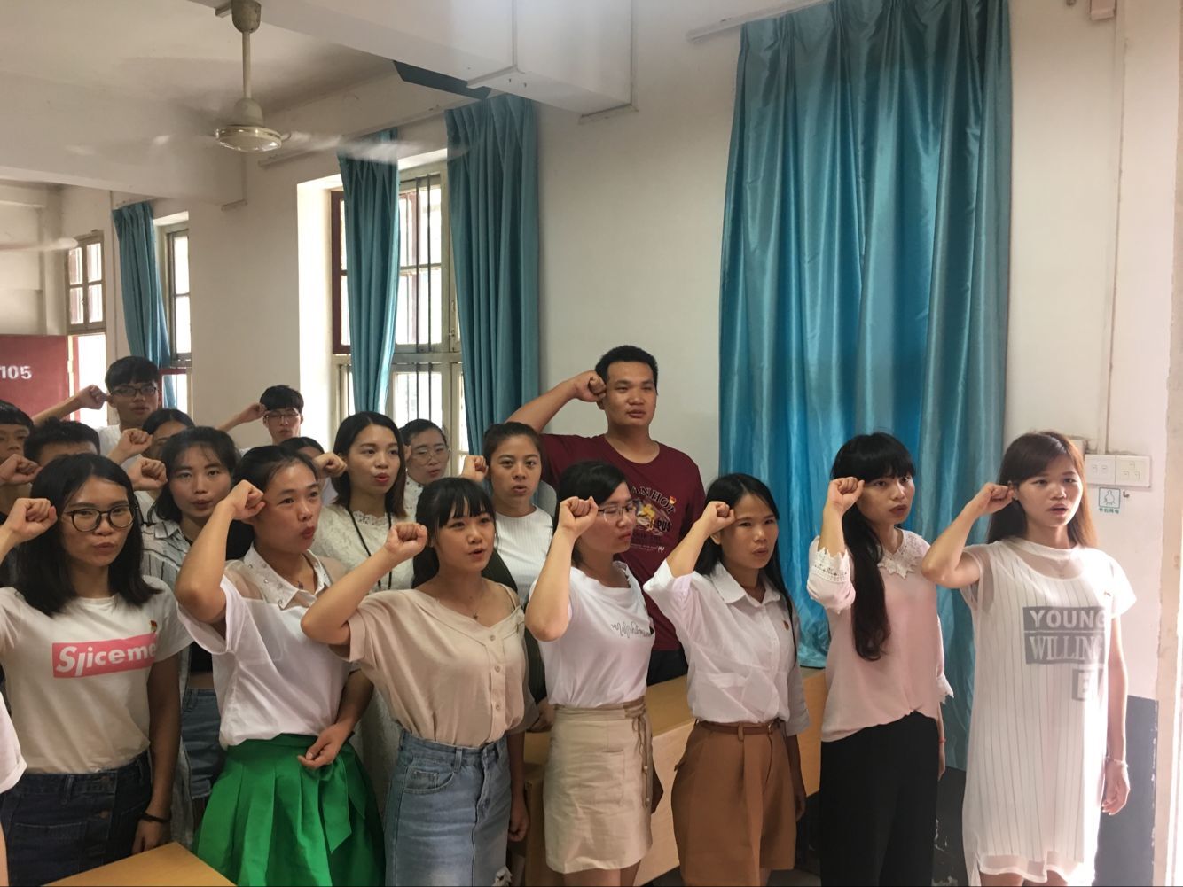 下午16:30分,全体起立,奏唱中华人民共和国国歌,座谈会在雄壮的国歌声中拉开序幕。随后,全体党员佩戴党徽,学生支部教师党员为即将走出校园的学生党员佩戴党徽。全体党员郑重地举起右手,面对党旗,重温入党誓词,由支部书记白兰领誓。