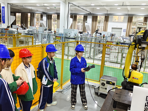 实训教室内,志愿者们化身“技术导师”,通过理论讲解与实操演示相结合的方式,向研学的同学们细致介绍了发那科机器人的基础编程、操作流程及安全规范。从指令输入到机械臂调试,引得同学们专注倾听,沉浸其中。支部志愿者成员重视互动体验,鼓励研学的同学们亲手操作机器人完成简单任务。当机械臂精准移动、灵活转动时,现场响起阵阵惊叹与掌声。