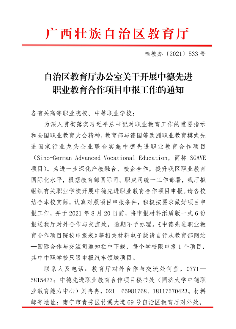 自治区教育厅办公室关于开展中德先进职业教育合作项目申报工作的通知(桂教办〔2021〕533号)