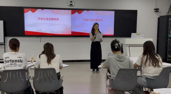 活动中,全体党员一同观看了2025年“‘青春心向党 奋斗新征程’党课开讲啦”比赛的优秀视频。视频中优秀党员的先进事迹和奋斗精神,深深感染了在场的每一位毕业生党员。随后,毕业生党员蒋云馨代表全体党员作出公开承诺:“离校不离党、退伍不褪色,以奋斗姿态书写青春答卷?!弊詈?,在何敏华的领誓下,全体党员面向党旗,在党旗下庄严宣誓。铿锵有力的誓言在教室中回荡,彰显了毕业生党员坚定不移听党话、跟党走的信念与决心。