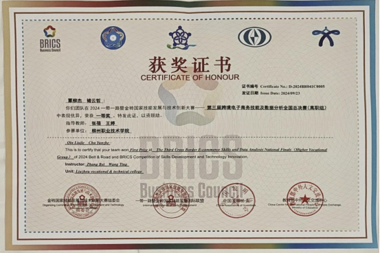 2024“一带一路”暨金砖国家技能发展与技术创新大赛-第三届跨境电子商务技能及数据分析全国总决赛(高职组)一等奖 来源: 发布时间:2025-05-30 10:40:27 浏览次数: 次 【字体:小 大】 一审:贸旅一审 终审:贸旅三审 分享到: 【打印正文】