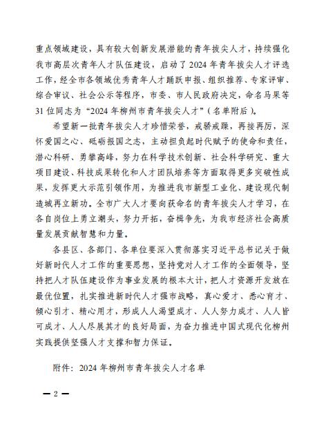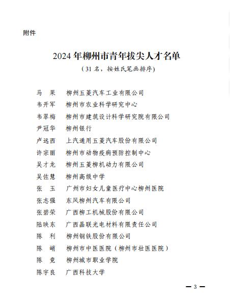 喜讯:我?;绻こ萄г何驴∠疾┦勘幻?024年柳州市青年拔尖人才” 来源: 发布时间:2024-05-15 17:45:28 浏览次数: 次 【字体:小 大】 新闻网消息(文、图/人事处 杨婉珍)近日,从中共柳州市委办公室《中共柳州市委员会 柳州市人民政府关于命名2024年柳州市青年拔尖人才的决定》(柳委〔2024〕77号)文件获悉,我校机电工程学院温俊霞博士被命名为“2024年柳州市青年拔尖人才”。文件截图 部门网站审核:人事处(党委教师工作部、教职工发展中心)韩霄 终审:人事处 分享到: 【打印正文】