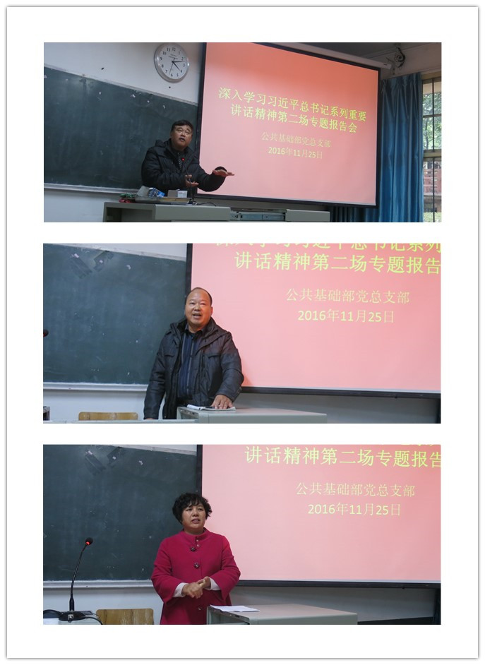 新闻网消息(文/图 公共基础部 黄志卫)2016年11月25日下午,公共基础部、思政部党总支在文华楼103教室,开展深化习近平总书记系列重要讲话学习研讨第二场专题报告会,包括“道路自信”和“树立创新、协调、绿色、开放、共享的发展理念”两个专题,分别由黄海峰、左妮红同志担任讲解员,会议由党总支组织委员黄志卫同志主持,公共基础部全体党员参加。