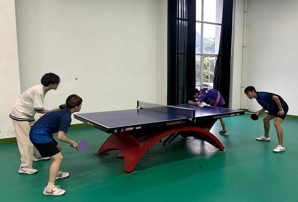 乒乓球队在进行双打训练
