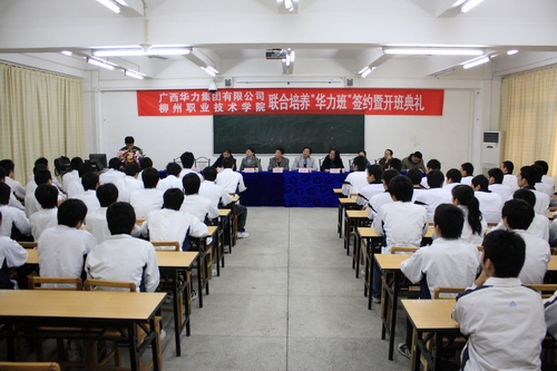 2010年4月15日,由柳州职业技术学院、广西华力集团有限公司联合培养的“华力班” 签约暨开班典礼在我院招生就业处一楼招聘室隆重举行。广西华力集团有限公司副总裁覃瑞民、综合管理部部长林玲女士、人力资源部部长吴晓轩、人力资源部招聘主管王勇、学院党委副书记阳旭、机电工程系党总支书记安掌明、汽车与环境工程系党总支书记牛永惠、机电工程系主任韦林、招生就业处副处长黄莉出席了典礼。参加此次典礼的还有“华力班” 的三十三名学员。典礼由机电工程系党总支书记安掌明同志主持。