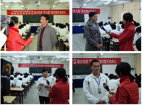 典礼结束后,广西电视台分别对公司副总裁覃瑞民、学院机电工程系韦林主任及华力班学员代表进行了采访,他们都表示“华力班”这样的校企联合培养模式非常有意义,该班的成功举办将会实现“企业、学校、学生”的三赢!