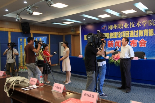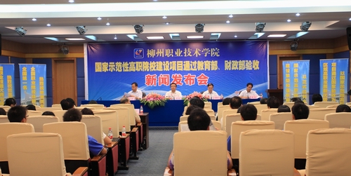 2010年7月26日上午,我院国家示范性高职院校建设项目通过教育部、财政部验收新闻发布会在柳州市新闻发布中心隆重举行。当天,来自《光明日报》、《广西日报》、广西电视台、《柳州日报》、《柳州晚报》、《南国今报》、柳州电视台、柳州人民广播电台、柳州教育网等各级媒体参加发布会。柳州市教育局党委书记殷茁雄出席发布会,与学院党委书记朱伟才,院长石令明,副书记阳旭一同在主席台上就座。学院领导及中层正职,部分学生代表参加发布会?;嵋橛傻澄笔榧茄粜裰鞒?。