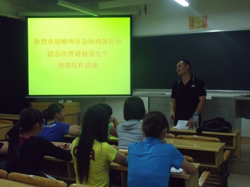 2010年10月11日晚,经济管理系特邀柳州市金海湾国际旅行社谢越强副总经理在博闻楼406教室给旅游管理2010级新生作“如何成为一名合格的旅游从业者”的专题讲座。旅游管理专业教师陈月明老师和部分2009级旅游管理专业同学到场聆听了本次讲座。