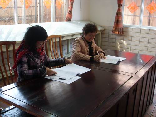 学生党支部书记龙思珍老师与老人康乐园负责人黎园长签署协议