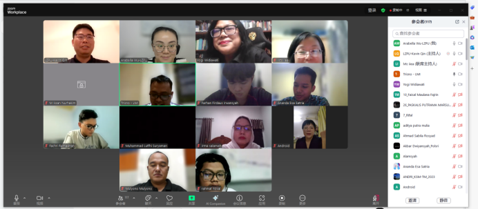 雅加达国立理工学院副校长助理Dr.Yogi Widiawati MHum、斯里维加亚理工学院国际合作部副主任Dr.Irma Salamah、柳工印尼机械有限公司售后副总经理Pak Trisno Raharjo,我校国际教育学院副院长吴兆辉,对外汉语团队教师以及印尼两所院校订单班学生111名参加了线上开班仪式。