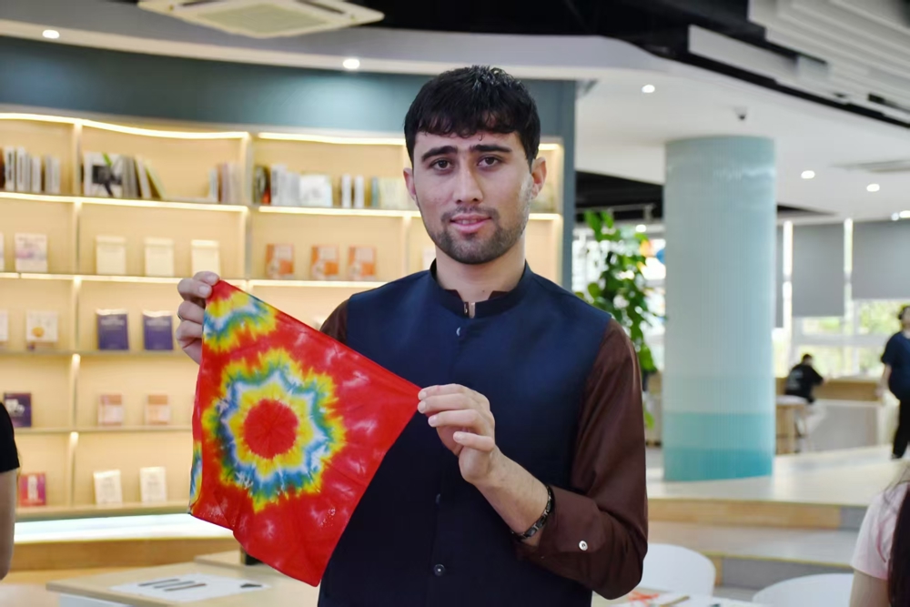 最激动人心的时刻莫过于解开束缚,在展开染布的那一刻。匠心大厅内惊叹声此起彼伏,如同开启一个个“色彩盲盒”:有的呈现出如冰裂纹般的清冷美感,有的绽放出放射状的星芒,还有的宛如层叠的繁花。留学生们兴奋地展示着自己的亲手制作的扎染方巾,用共同的语言交流着折叠心得和捆扎技巧的独特发现。小小一方扎染方巾,超越了国籍的界限,成为连接中外学子、共享传统技艺乐趣的无形纽带。